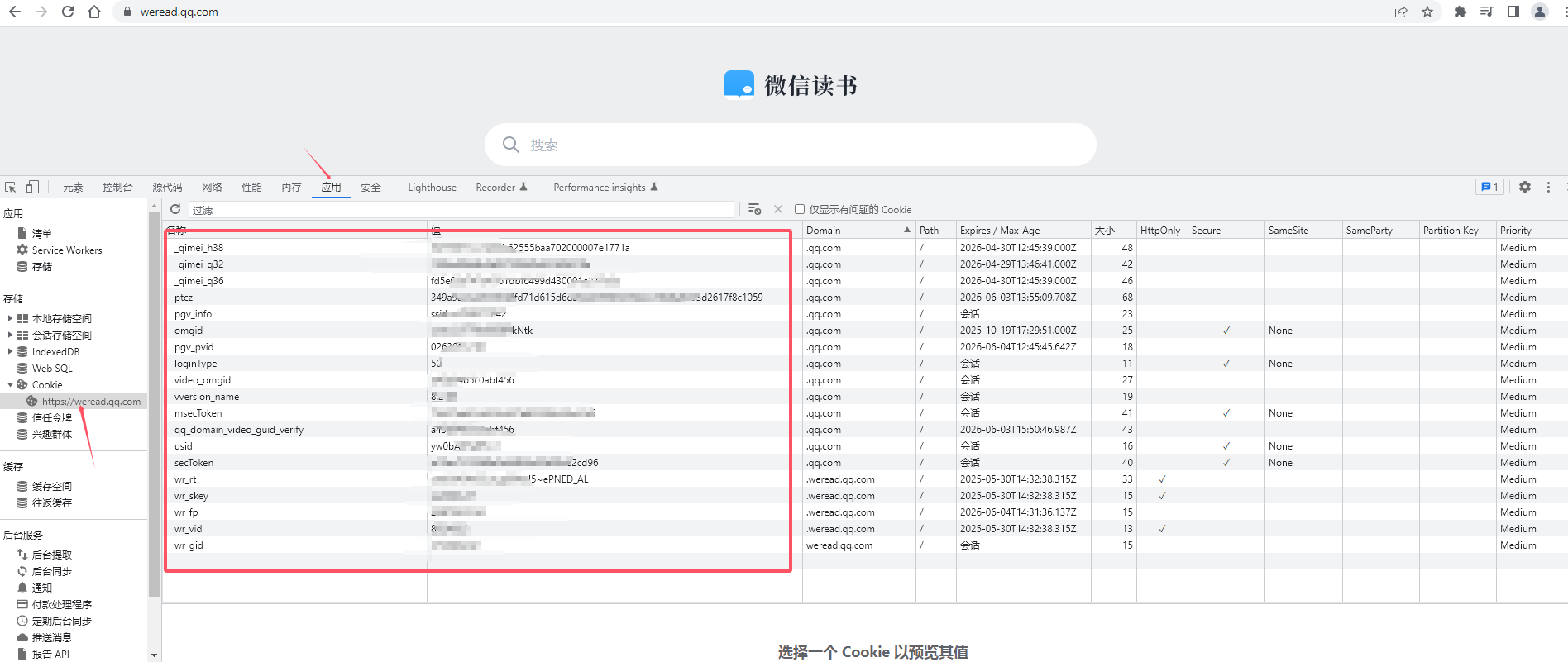 F12打开开发者工具或者检查,切换到 应用 标签。 - 刷新页面,任意点击一个请求(如书籍列表),在 Cookies 部分复制所有 Cookie 值。