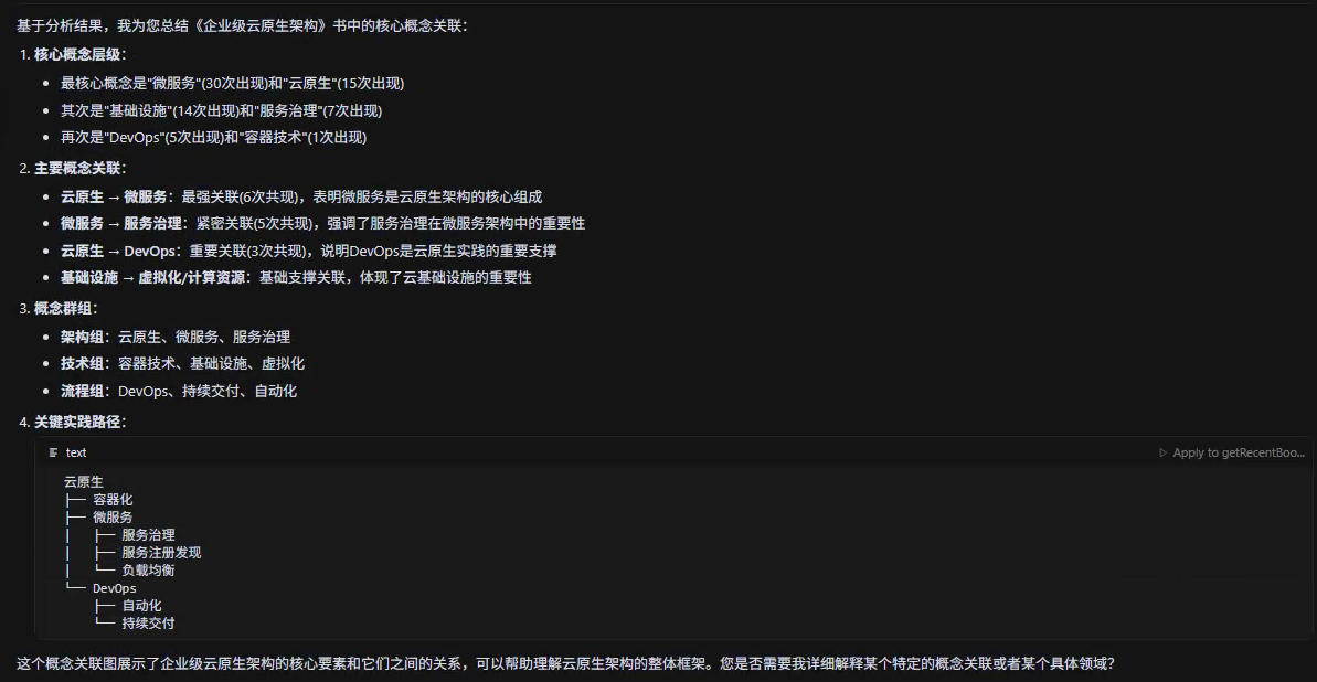 - 知识图谱构建: 将多本书籍的关联内容可视化,例如:生成《企业级云原生架构》这本书中的概念关联图。