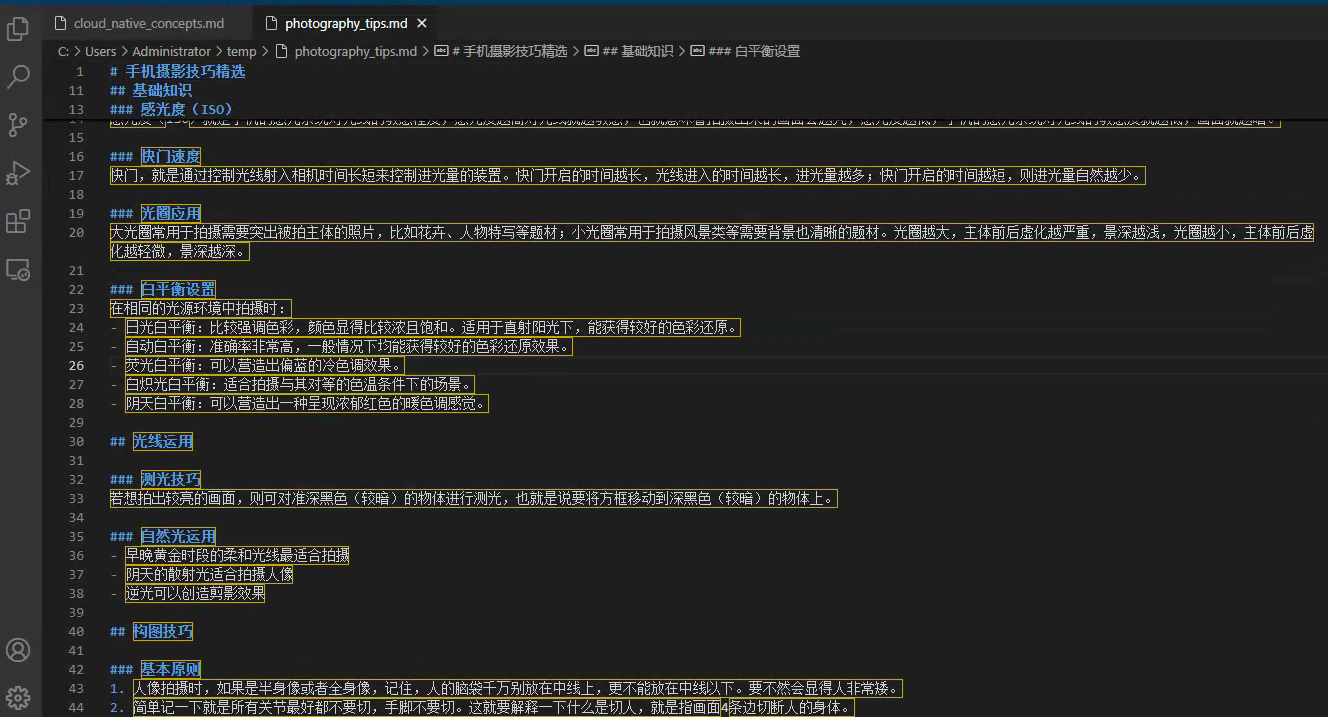 - 知识共享: 比如:根据《手机摄影技法大全》来提取摄影知识,并生成分享文档。