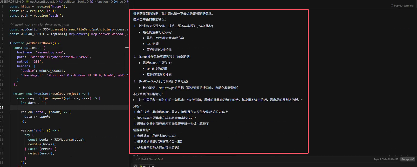 通过 Cursor AI与微信读书 MCP 服务器的结合,用户能够突破平台限制,将阅读数据转化为可操作的知识资产。该方案不仅提升了阅读效率,还为 AI 辅助学习、创作和协作提供了全新可能性。