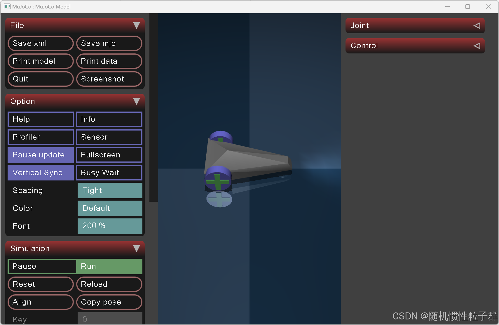点击simulate.exe执行文件,可以发现弹出mujoco仿真环境的显示界面: