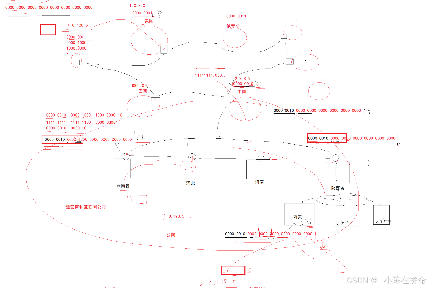所以真实的网络情况是,他用公网IP来构建全球网络,然后划分到一定程度后(某个地区),比如划分到西安市,再由当地的运营商拿到具体的公网IP后,再根据这个公网IP来构建内网!