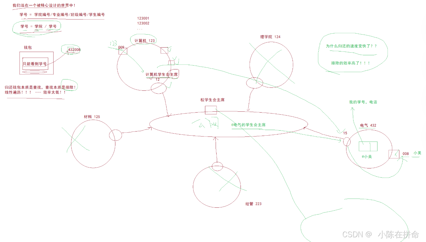 我是计算机123009学生,我有一天捡到了一个钱包,上面写的是432008,但是我只知道计算机学院开头是123,但是这个432我并不清楚,于是我只能去学校门口一个个问,但是查找本质上是排除,因此这种线性遍历的效率太低了!!