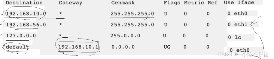 再跟第二行的子网掩码做与运算得 到192.168.56.0,正是第二行的目的网络地址,因此从eth1接口发送出 去;