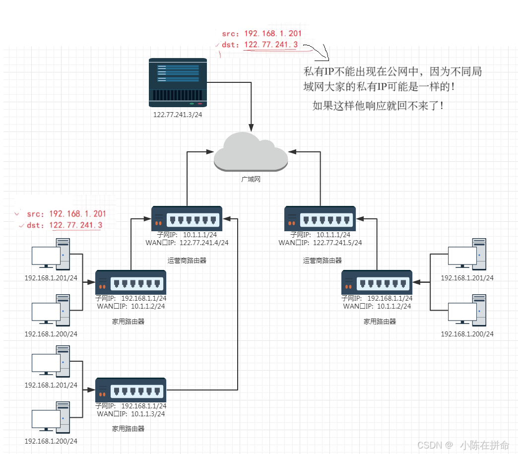 怎么解决上面的问题呢??我们会发现我们的路由器都有自己的子网IP和WAN口IP ,而我们家用路由器的WAN口IP就是运营商路由器的内网IP。所以报文在从路由器出去的时候会做一种策略:将源IP替换成每一个路由的的WAN口IP!!