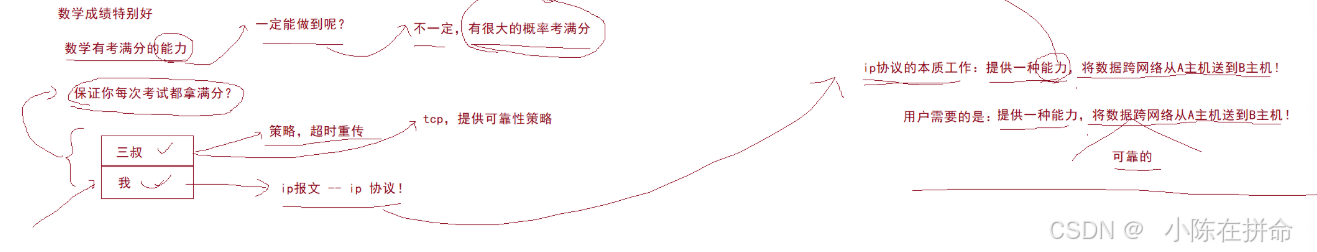 此时我就相当于是IP层(跑腿的能力),而三叔就相当于是TCP层(提供可靠性决策)。所以总的来说,用户需要的是一种可以将数据可靠地跨网络从A主机送到B主机的能力,而其中IP协议的本质工作就是提供一种能力,将数据跨网络从A主机送到B主机!!而TCP协议就是提供策略保证这个过程的可靠性。