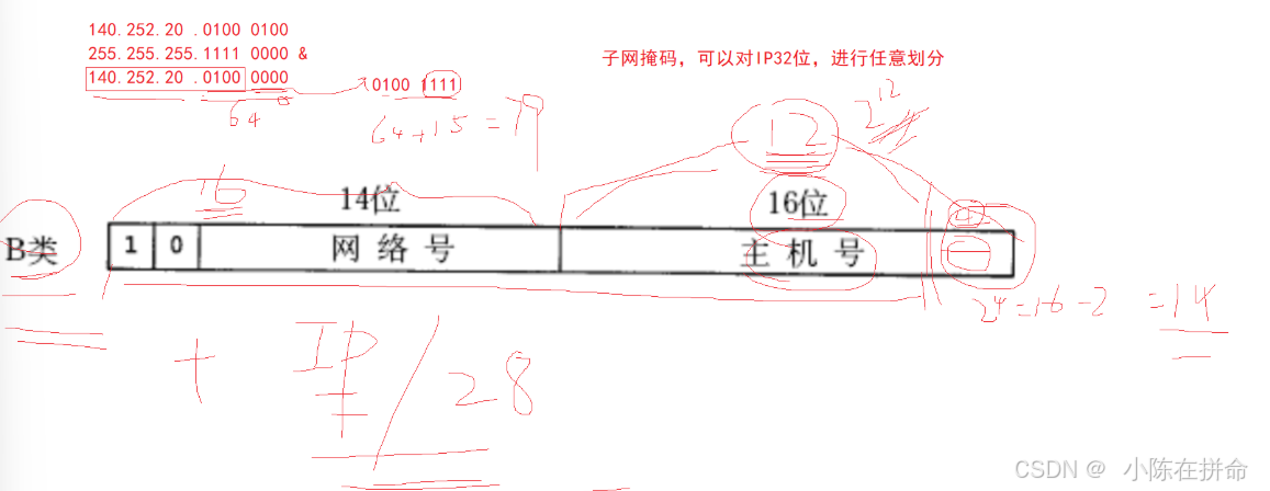 而后有了子网掩码,使得我们可以自己去做内网划分,比如我发现其实我只要4个bit位就可以表示14台主机了,因此我规定只有后面4位表示主机号,因此我们可以用IP/28!!这样我一次最多可以有14个IP地址(16-2)这样提高了地址的利用率 (一个B网络就可以使用2的12次方个大小为14个主机号的网络)