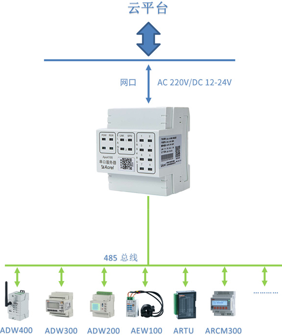 多设备接入:通过一台串口服务器可连接多台串口设备(如安科瑞APort100支持8路RS-485接口,每路可接30台设备),显著提升系统扩展能力。