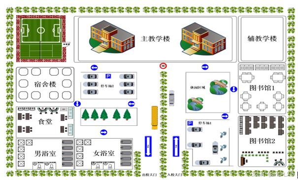 在校师生所必需的生活产所。学校教学设施完善,配备有多媒体教室、微机教室、教育管理系统、财务管理系统、学生管理系统等设施为在校的千余名师生提供一个良好的生活和学习的环境。整体校园的平面图如下图所示