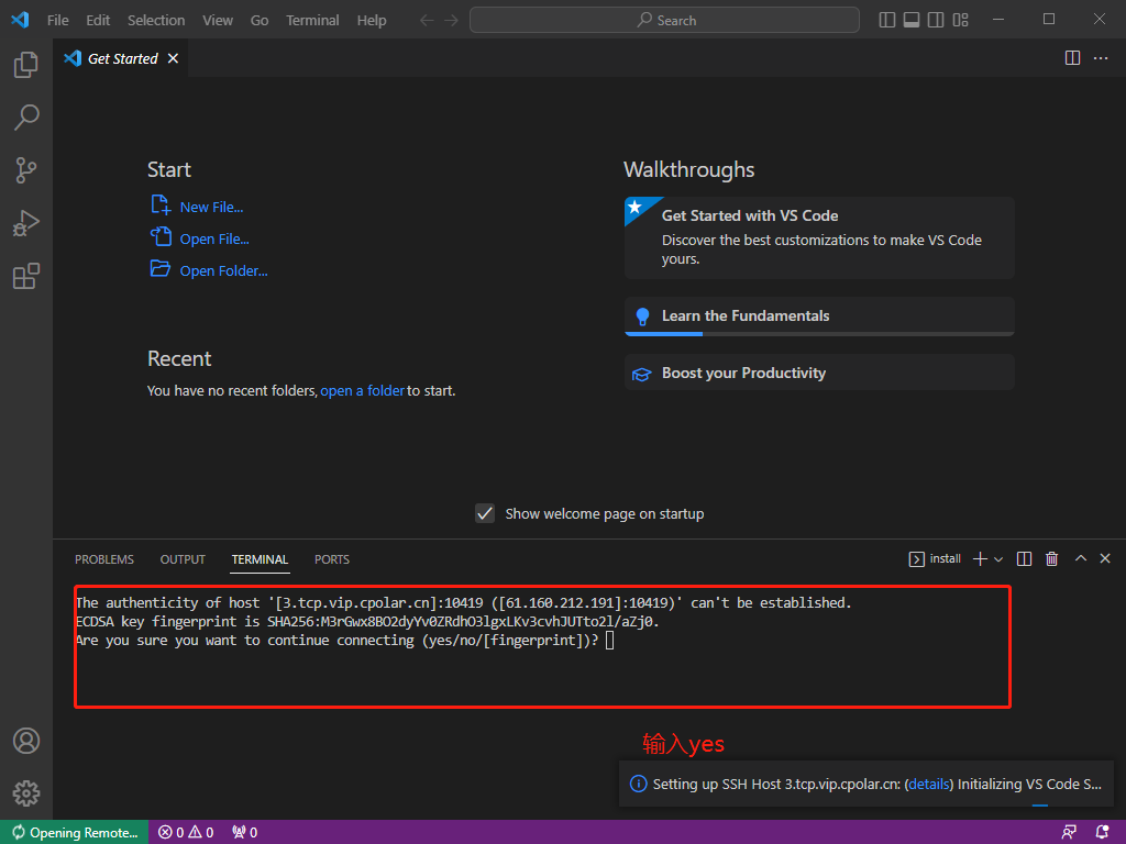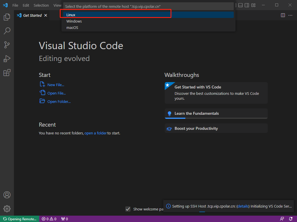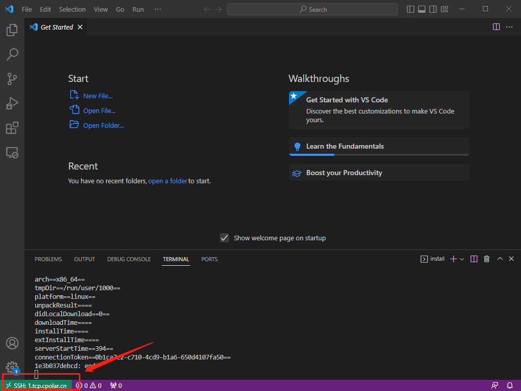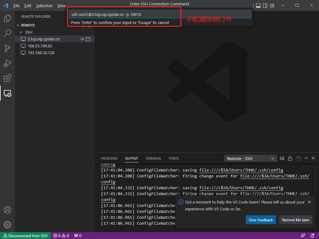 在windows上打开vscode,使用所复制的公网地址来远程SSH。