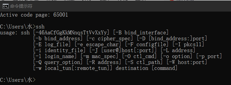 显示OpenSSH安装成功后,在打开本地cmd进入之后输入命令ssh