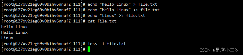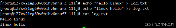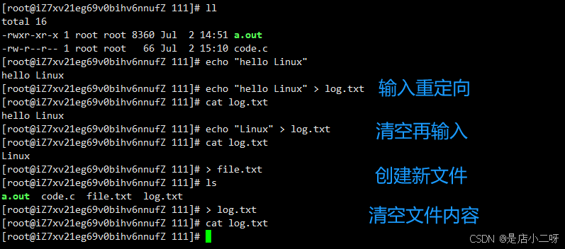 - 清空文件、创建文件(每次进行重定向,都会清空文件后在写入文件内容)