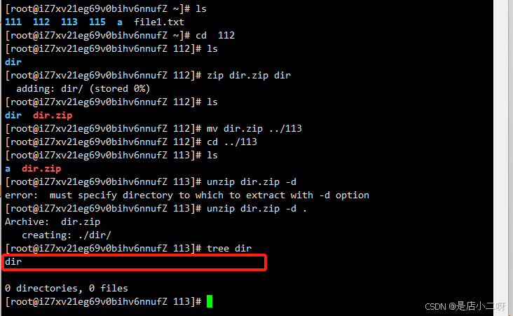 对于压缩dir目录到解压dir目录中,导致解压出来一个空目录情况,是由于压缩dir目录时,没有使用-r递归处理,将指定目录下的所有文件和子目录一同压缩到.zip文件中。