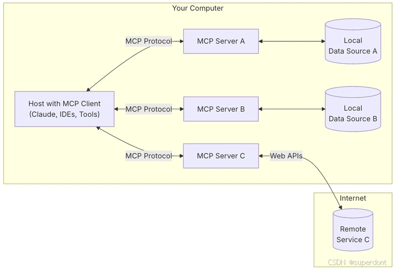 ⮕ MCP 客户端 (MCP Client): MCP 客户端在主机环境中充当中间人,管理 MCP 主机与一个或多个 MCP 服务器之间的通信。它向 MCP 服务器发起请求,查询可用功能,并检索描述服务器能力的响应。这确保了主机与外部工具之间的无缝交互。