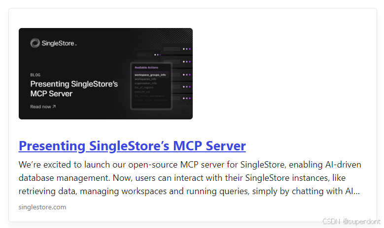 我们很高兴推出我们用于 SingleStore 的开源 MCP 服务器,实现 AI 驱动的数据库管理。现在,用户可以通过与像 Claude 或 Cursor 这样的 AI 助手聊天,来与他们的 SingleStore 实例进行交互,例如检索数据、管理工作区和运行查询。