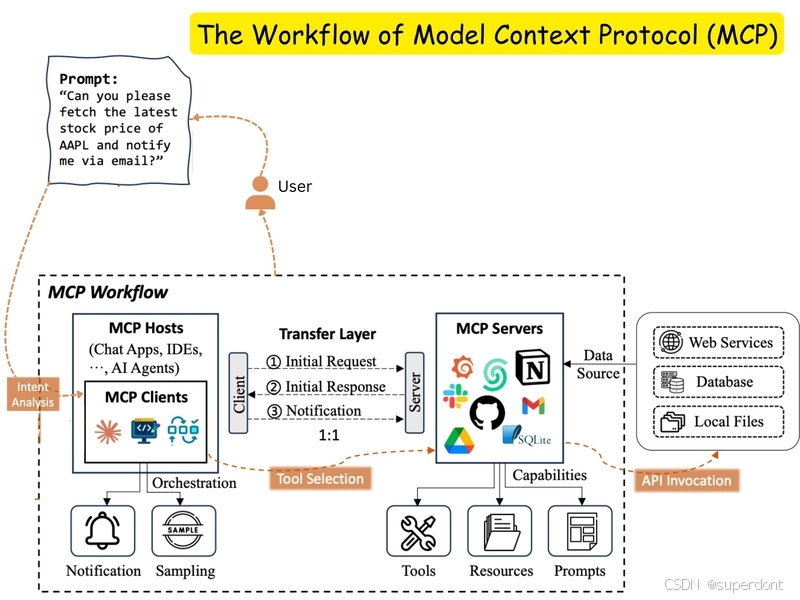 如上图所示,在一个典型的工作流程中,用户向 MCP 客户端发送提示 (prompt),客户端分析意图,通过 MCP 服务器选择合适的工具,并调用外部 API 来检索和处理所需信息,然后将结果通知用户。