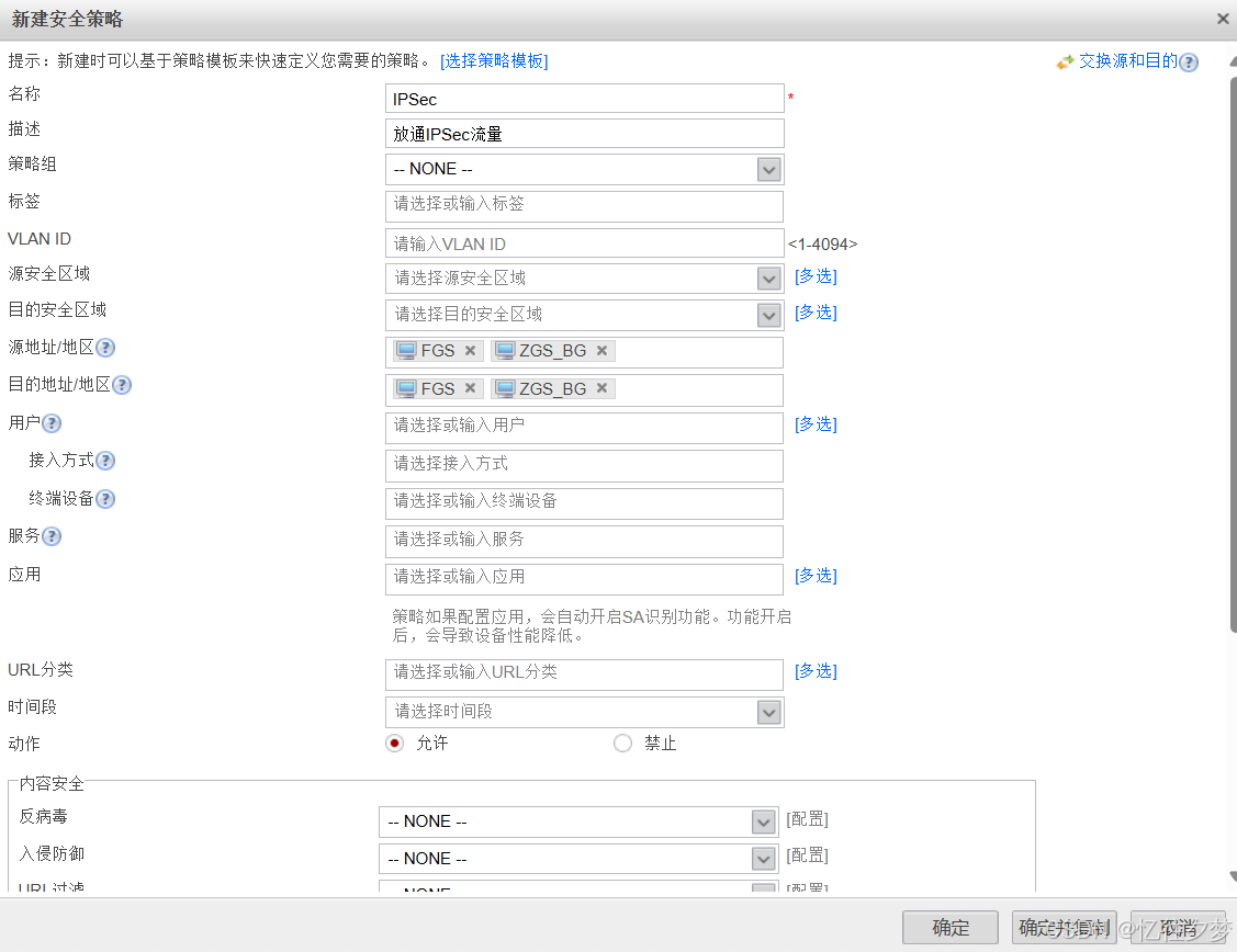 需要放通公网电信与内网的双向流量,因为我们只使用了电信链路配置IPSec通道。