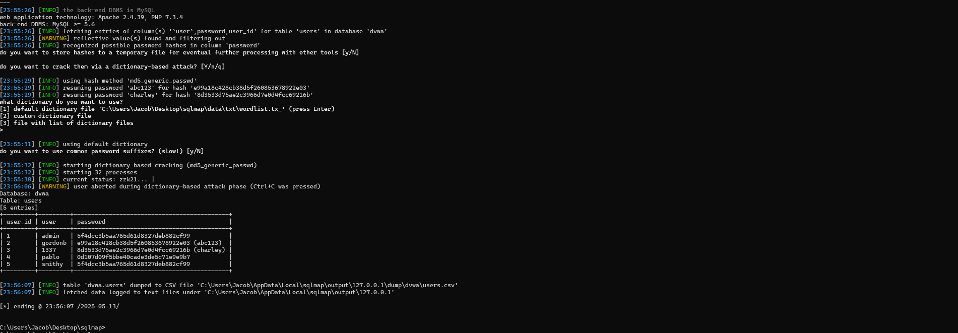 通过以上步骤,我们完成了对DVWA初级难度的SQL注入测试,成功获取了所有用户名和密码。