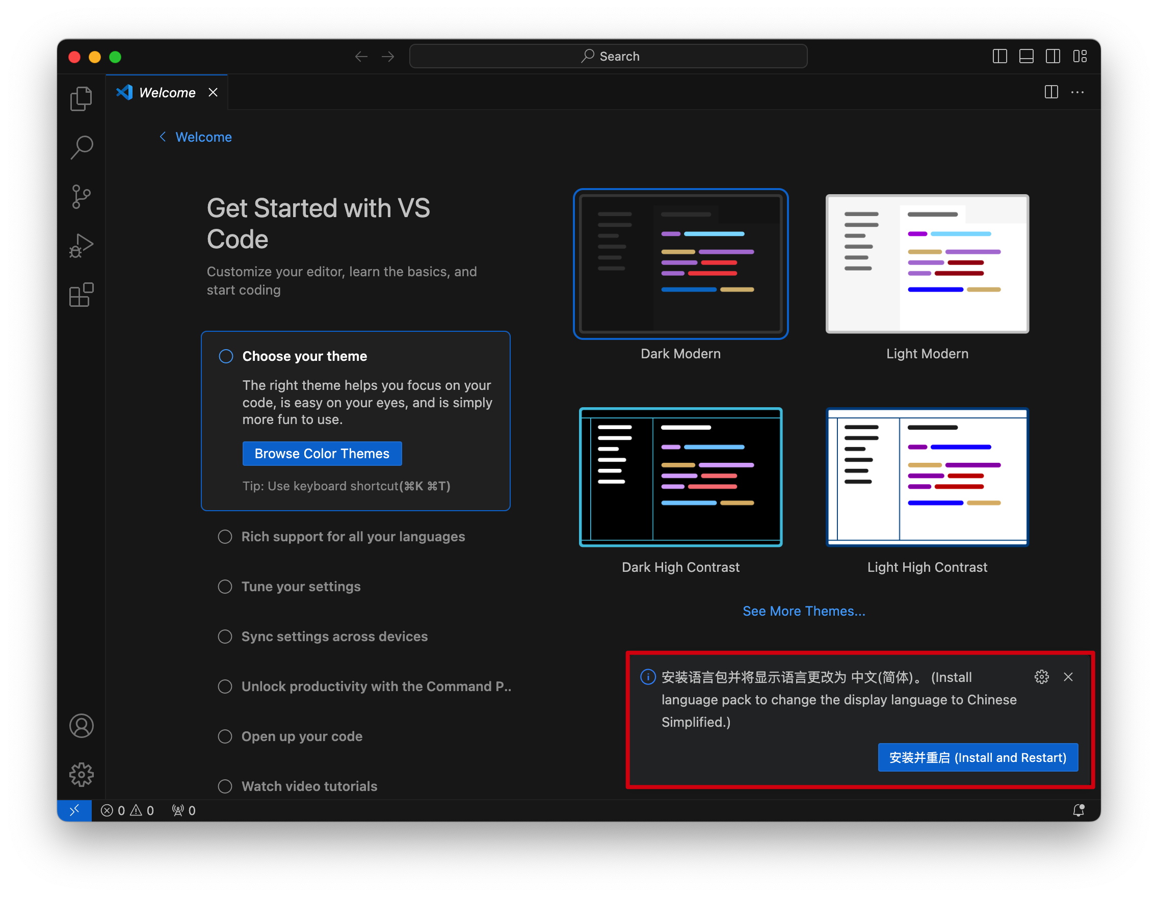 启动 VSCode 之后 , 会弹出 安装中文语言包 提示 , 这里点击 " 安装并重启 " 按钮 ;