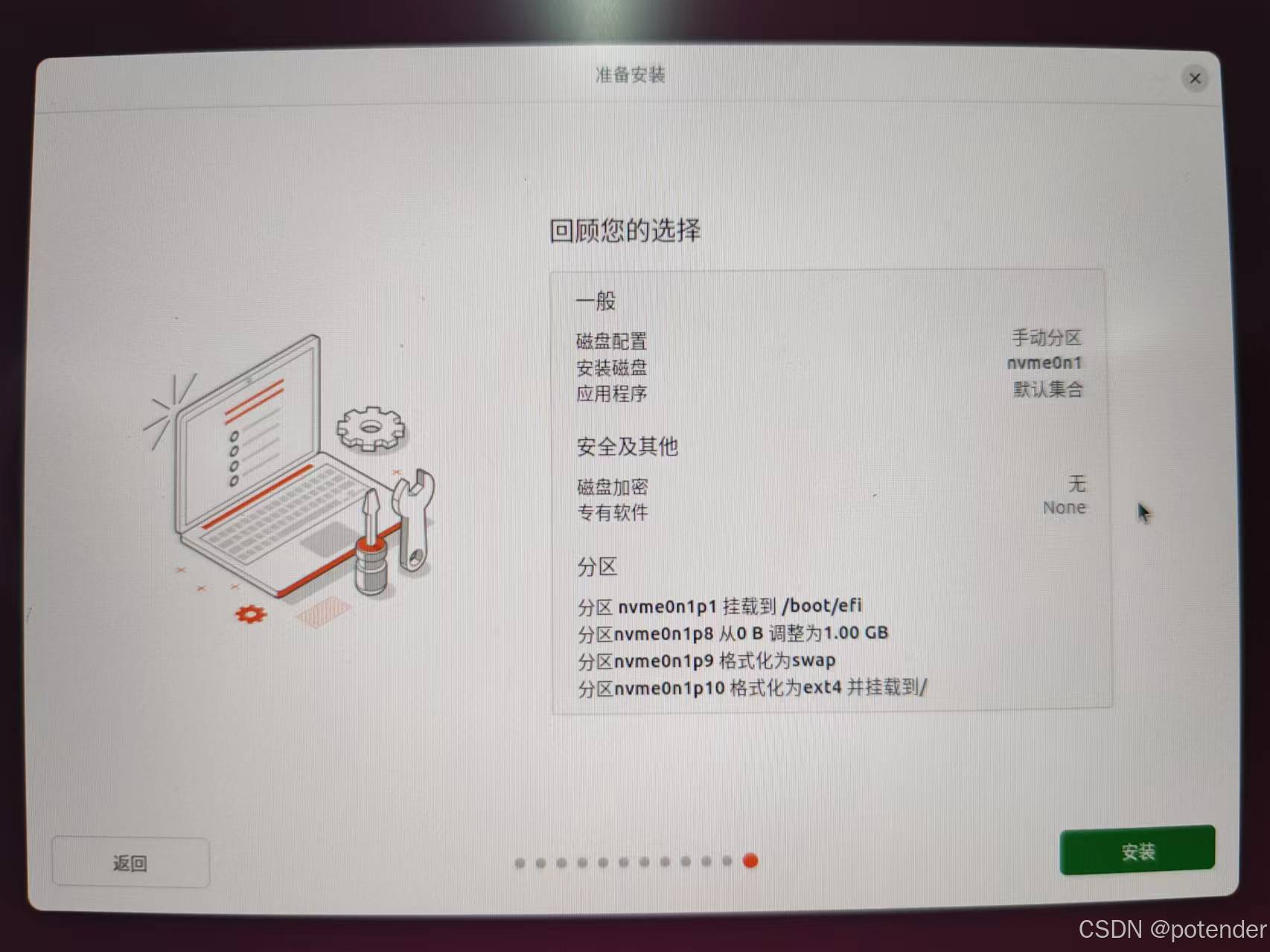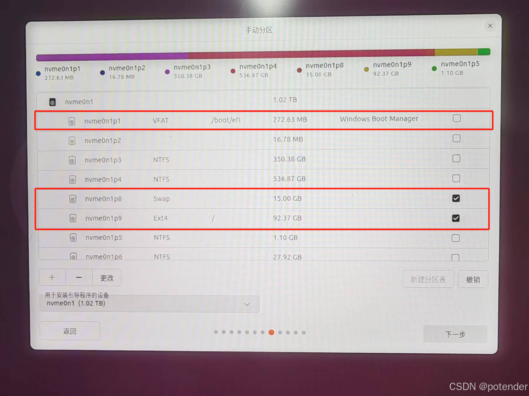 除此之外,安装启动引导的设备现在选项没有之前那么多了(我只有两个选项),选efi所在盘,最后结果如图(不是我刚才分区的结果图,这个图是本来打算分配1G的系统内存,但是发现efi不用分配):