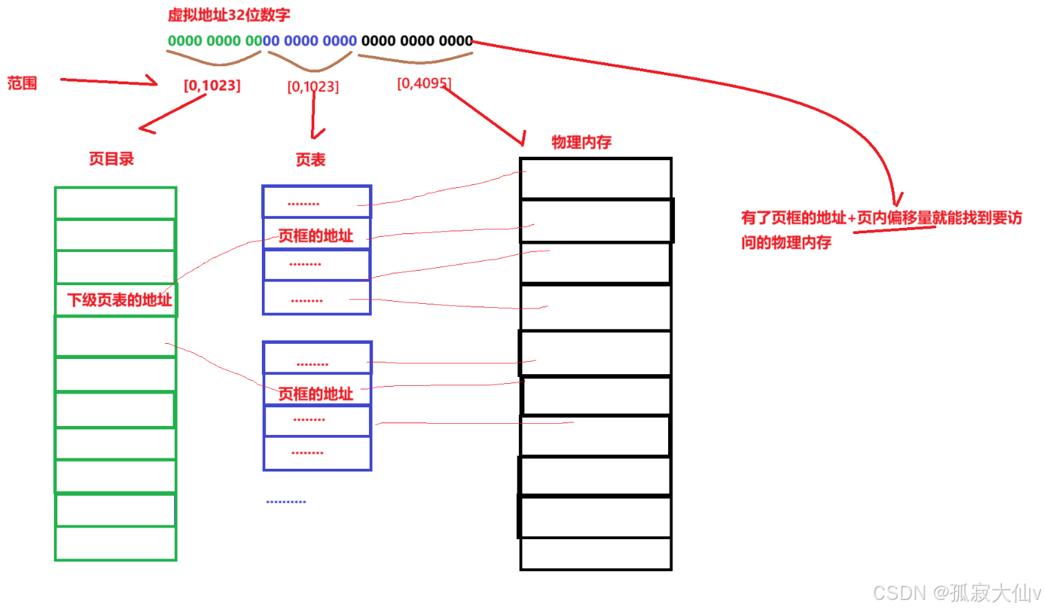 如图虚拟地址的前10位查页目录表,找到对应的页表地址。中间10位查页表,找到对应的页框的地址。最后12位页框内部的偏移量。这时就拿到了页内偏移量,就能找到对应的物理内存的地址了(页框地址+页内偏移量)。