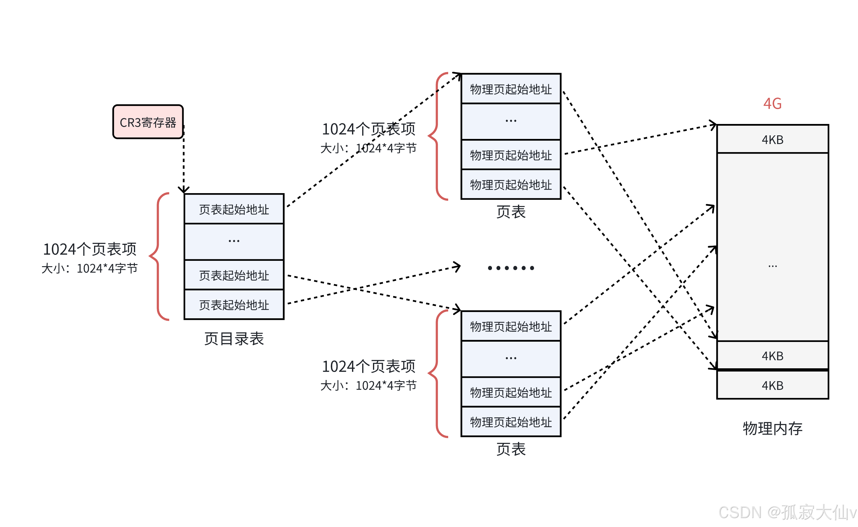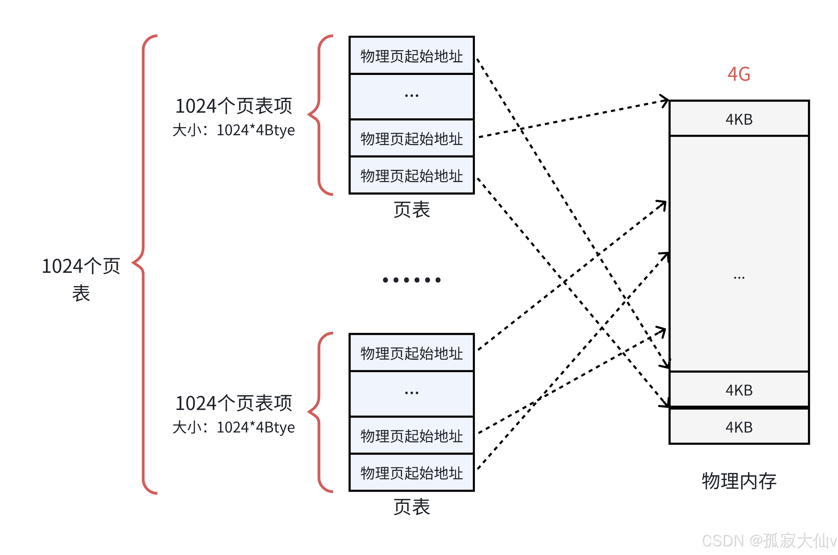 把这个单⼀页表拆分成 1024 个体积更小的映射表。如下图所示。这样⼀来,1024(每个表中的表项个数) * 1024(表的个数),仍然可以覆盖 4GB 的物理内存空间。 这里的每⼀个表,就是真正的页表,所以⼀共有 1024 个页表。⼀个页表自身占用 4KB ,那么1024 个页表⼀共就占用了 4MB 的物理内存空间,和之前没差别啊?