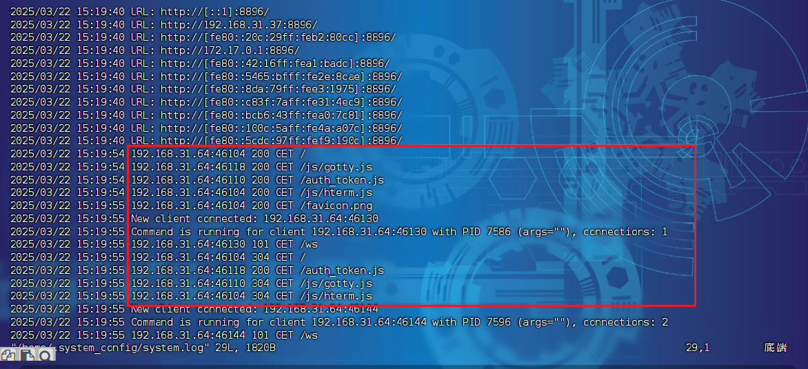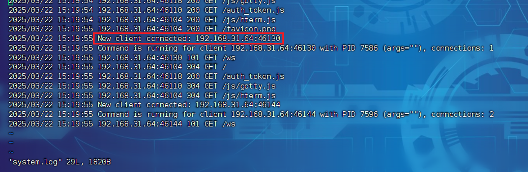 发现这个是一个 GoTTY 服务的运行日志。GoTTY 是一个将命令行工具转换为 Web 服务的工具,允许用户通过浏览器访问终端会话。