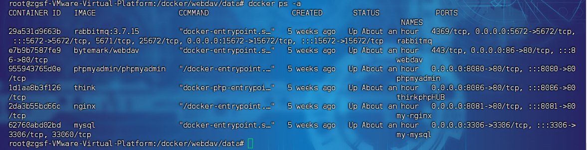 可以看到容器有: webdav,phpmyadmin,think,nginx,mysql,rabbitmq