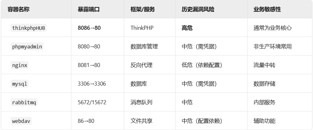 其中thinkphp的漏洞风险更大,所以我们优先去排查该容器