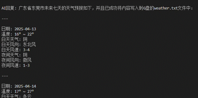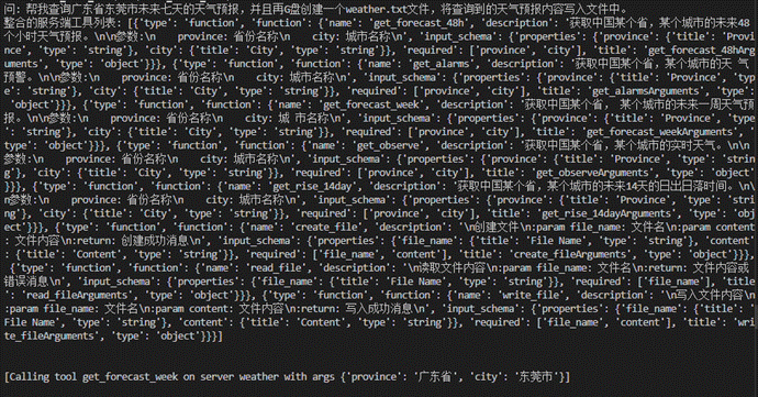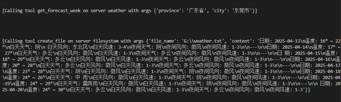 - 获取到天气信息后,将结果返回给LLM,LLM获取数据后,还有一步没有做,紧接着就调用了文件创建的工具: