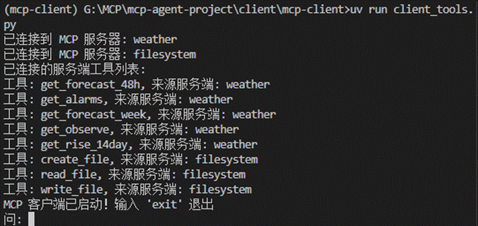 ") # 将工具调用的结果添加到 messages 中 messages.append({ "role": "tool", "content": result.content[0].text, "tool_call_id": tool_call.id, }) else: # 如果没有工具调用,返回最终的回复 return content.message.content async def chat_loop(self): """运行交互式聊天循环""" print("MCP 客户端已启动!输入 'exit' 退出") while True: try: query = input("问: ").strip() if query.lower() == 'exit': break response = await self.process_query(query) print(f"AI回复: {response}") except Exception as e: print(f"发生错误: {str(e)}") async def clean(self): """清理所有资源""" await self.exit_stack.aclose() self.sessions.clear() self.tools_map.clear() async def main(): # 启动并初始化 MCP 客户端 client = MCPClient() try: # 连接多个 MCP 服务器 await client.connect_to_server("weather", '../../server/weather/weather.py') await client.connect_to_server("filesystem", '../../server/filesystem/filesystem.py') # 列出 MCP 服务器上的工具 await client.list_tools() # 运行交互式聊天循环,处理用户对话 await client.chat_loop() finally: # 清理资源 await client.clean() if __name__ == "__main__": asyncio.run(main()) |