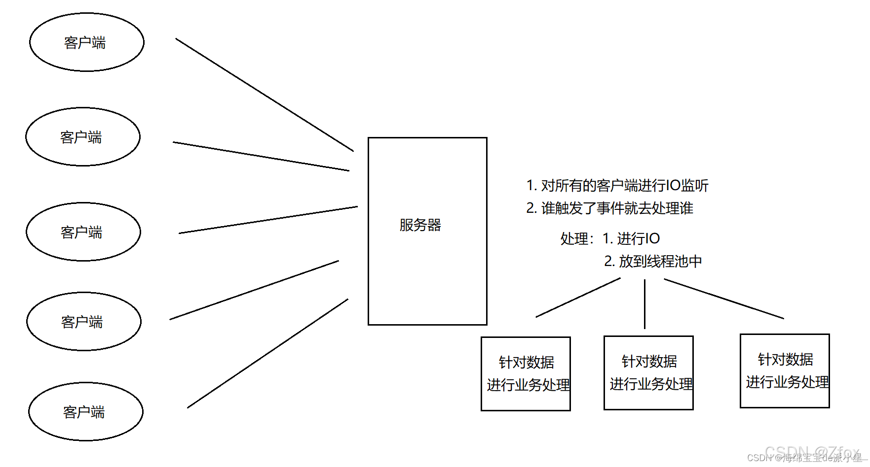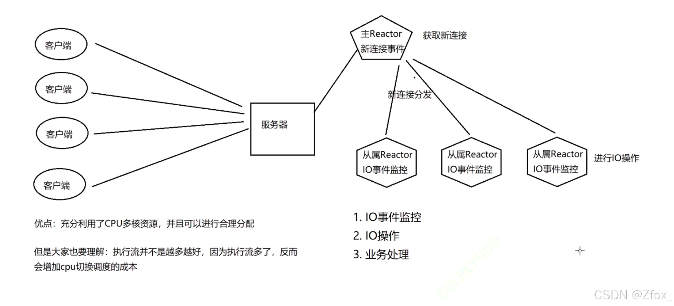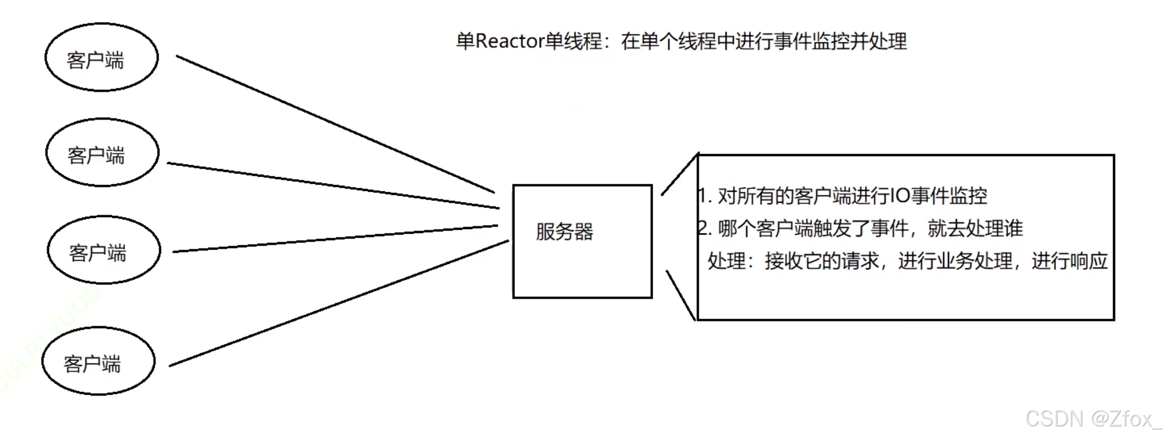 - 缺点:在单个 Reactor 线程中,包含了对所有客户端的事件监控,以及所有客户端的 IO 操作,不利于高并发场景 (每一个时刻都有很多客户端连接)