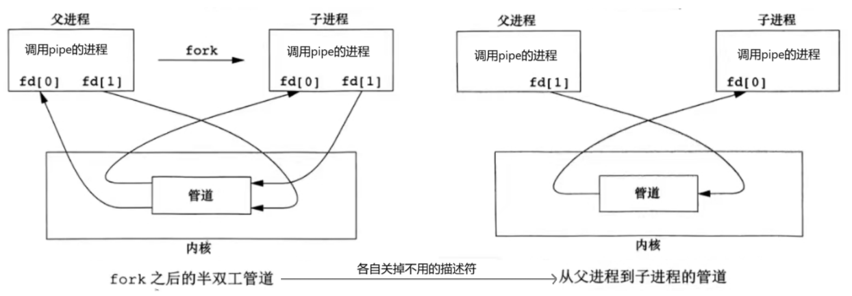 匿名管道(无名管道):单向通信,只能用于有亲缘关系的进程(如父子进程),通过pipe( )系统调用创建。