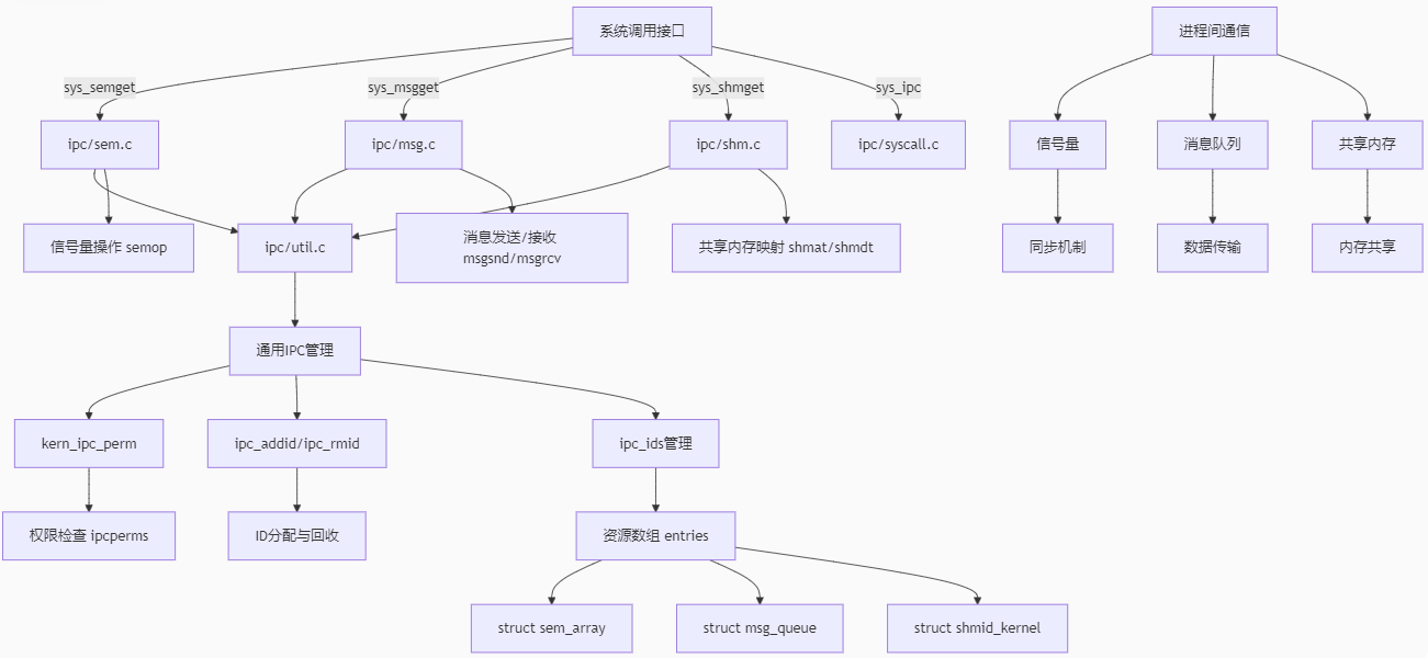 内核通过 统一权限模型(kern_ipc_perm)+ 分类资源管理(信号量/消息队列/共享内存)+ 命名空间隔离 实现IPC资源的高效组织。核心逻辑集中在ipc/util.c中提供通用服务,具体资源由各自模块实现,系统调用作为用户入口。