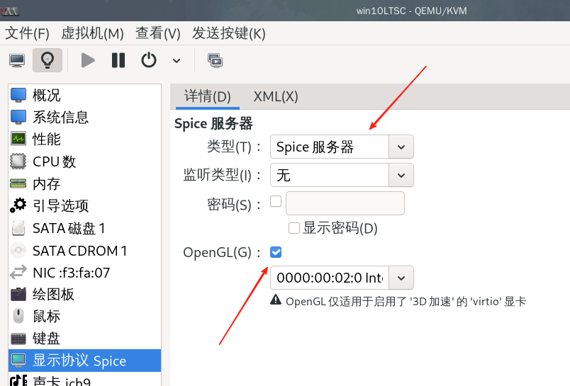 - 显示协议Spice,类型:Spice服务器 ,开启OpenGL 。之前默认是VNC