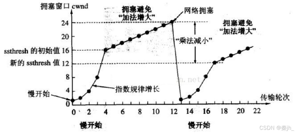 - 在每次超时重发的时候, 慢启动阈值会变成原来的一半, 同时拥塞窗口置回1。