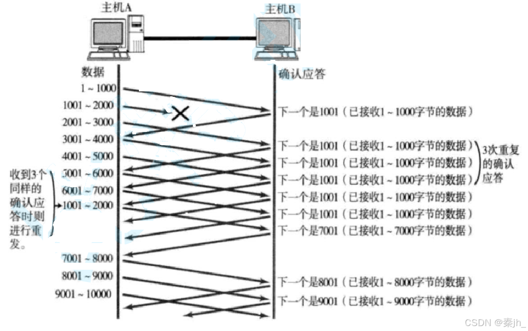 - 如果发送端主机连续三次收到了同样一个 "1001" 这样的应答, 就会将对应的数据 1001 - 2000 重新发送;