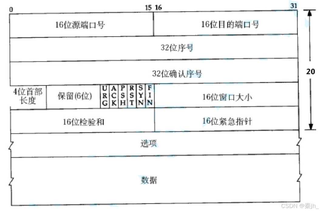 - 4 位 TCP 报头长度: 表示该 TCP 头部有多少个 32 位 bit(有多少个4 字节); 所以TCP 头部最大长度是 15 * 4 = 60 字节,最短长度是固定的20字节。