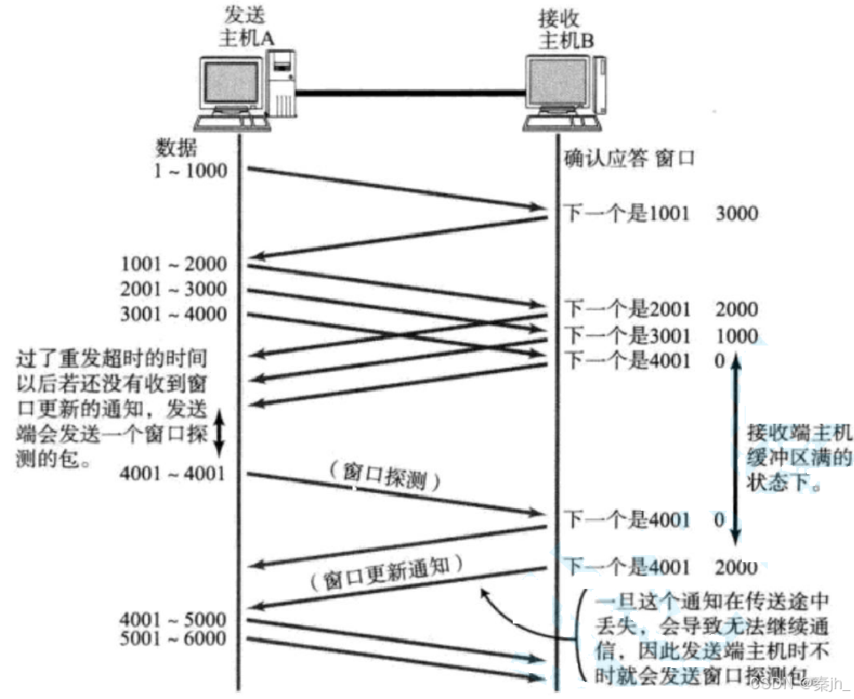 - 如果接收端缓冲区满了, 就会将窗口置为 0; 这时发送方不再发送数据, 但是需要定期发送一个窗口探测数据段, 使接收端把窗口大小告诉发送端.