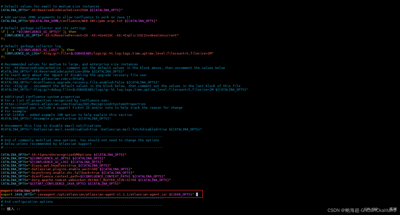 unzip atlassian-agent-v1.3.1.zipmv atlassian-agent-v1.3.1 /opt/atlassian/vim /opt/atlassian/confluence/bin/setenv.shexport JAVA_OPTS="-javaagent:/opt/atlassian/atlassian-agent-v1.3.1/atlassian-agent.jar ${JAVA_OPTS}"