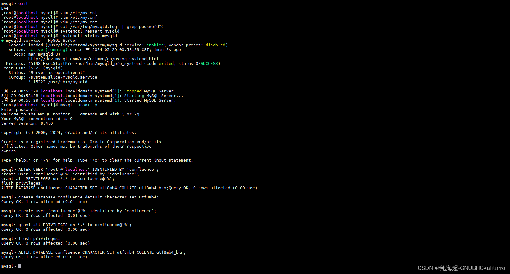systemctl restart mysqldmysql -uroot -pALTER USER 'root'@'localhost' IDENTIFIED BY 'confluence';