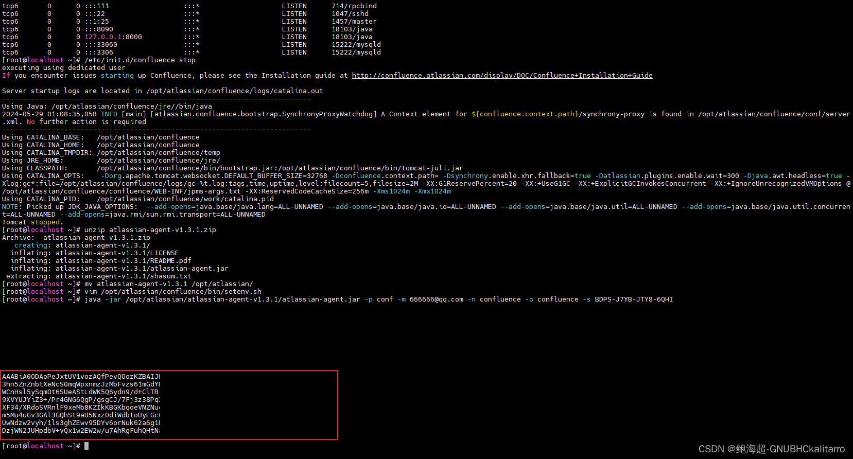java -jar /opt/atlassian/atlassian-agent-v1.3.1/atlassian-agent.jar -p conf -m 666666@qq.com -n confluence -o confluence -s BDPS-J7YB-JTY8-6QHI