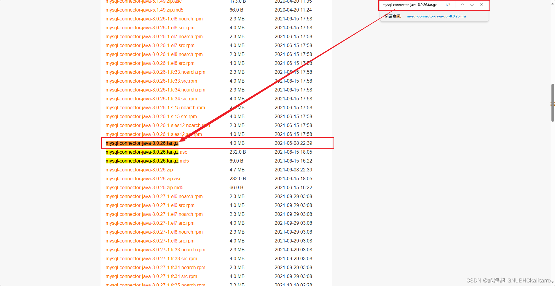 进入了这个网站,发现好多的安装包,你可以按键盘上的“ CTRL + F ” 进行查找内容为: mysql-connector-java-8.0.26.tar.gz