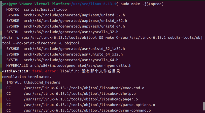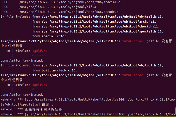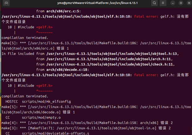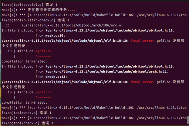 从报错信息 “fatal error: libelf.h: 没有那个文件或目录” 和 “fatal error: gelf.h: 没有那个文件或目录” 可知,是缺少相关开发库文件导致编译失败 。libelf 库用于处理 ELF(可执行与可链接格式)文件,编译内核时部分工具和模块依赖它。
