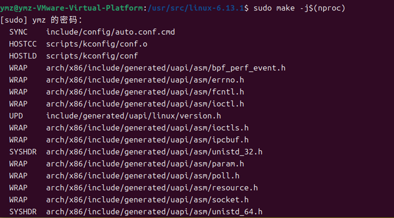 利用make命令开始编译内核。使用 -j 选项来多线程处理,可以更有效的利用CPU资源。参数是并发数量,通常可以是CPU的2倍。如图18所示,使用sudo make -j$(nproc)。sudo make -j$(nproc) 是在 Linux 系统中用于并行编译内核或其他软件项目的命令。