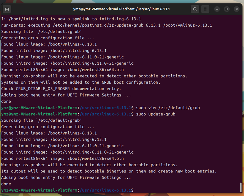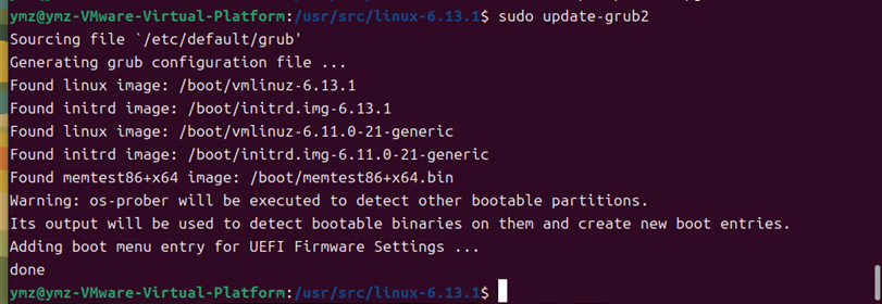 此时警告提示变为os-prober will be executed...,说明配置修改生效,os-prober工具已能正常执行去检测其他可引导分区,这是预期的正确状态。可查看/boot/grub/grub.cfg文件(使用sudo cat /boot/grub/grub.cfg查看内容),确认新内核及其他相关启动项是否正确添加。