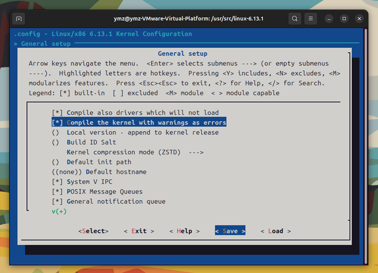 如图所示,将Compile also drivers which will not load和Compile the kernel with warnings as errors设置成将该功能编译进内核。进行保存后退出。(也可以不配置这两项内容,保持默认配置,Save--->ok--->Exit--->Exit)。