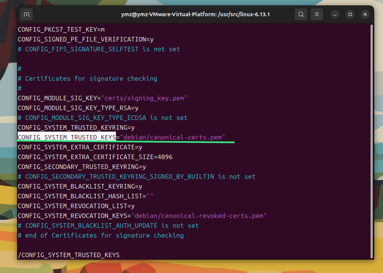 如图17所示,在 vim 命令模式下(进入 vim 后默认是命令模式,如果不是,按 Esc 键进入 ),输入 /CONFIG_SYSTEM_TRUSTED_KEYS ,然后按回车键。vim 会自动定位到首次出现该配置项的位置 。如果位置不对,可按 n 键查找下一个匹配项。找到之后,按i键进入插入模式,删除双引号内的内容(如果有 ),使其变为 CONFIG_SYSTEM_TRUSTED_KEYS="" 。同理,找到 CONFIG_SYSTEM_REVOCATION_KEYS 所在行,按i键进入插入模式,删除双引号内的内容(如果有 ),设置为 CONFIG_SYSTEM_REVOCATION_KEYS="" 。