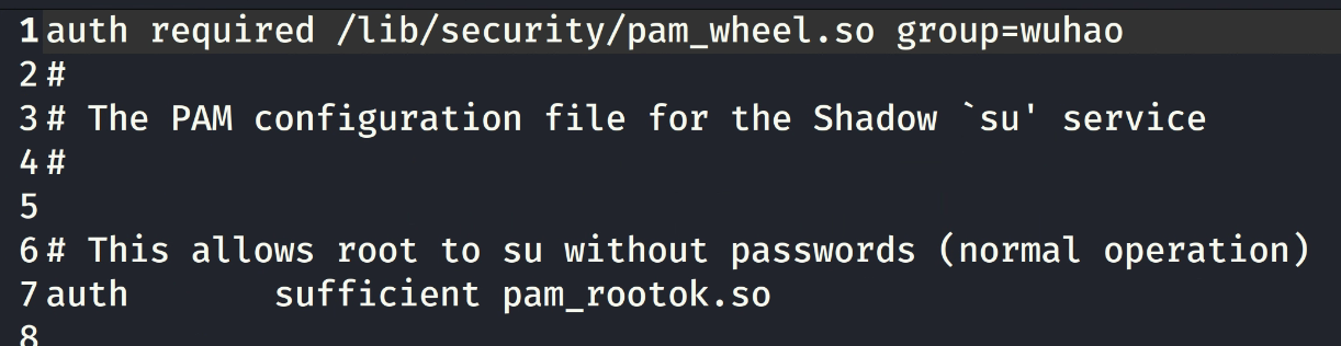 (7)限制su命令提权: /etc/pam.d/su文件,在头部添加命令: